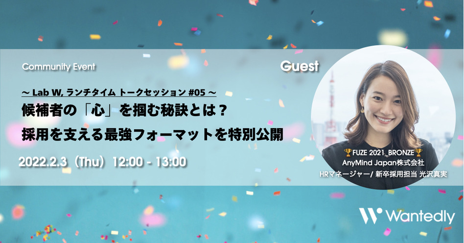 ウォンテッドリー株式会社が主催する、年に一度の大型カンファレンス『FUZE 2021Award』にて、【Best Team of the Year BRONZE】を受賞したAnyMind Japan株式会社をゲストにお迎えし、採用広報から選考まで、候補者のマインドを掴むための施策をお話いただきます。
