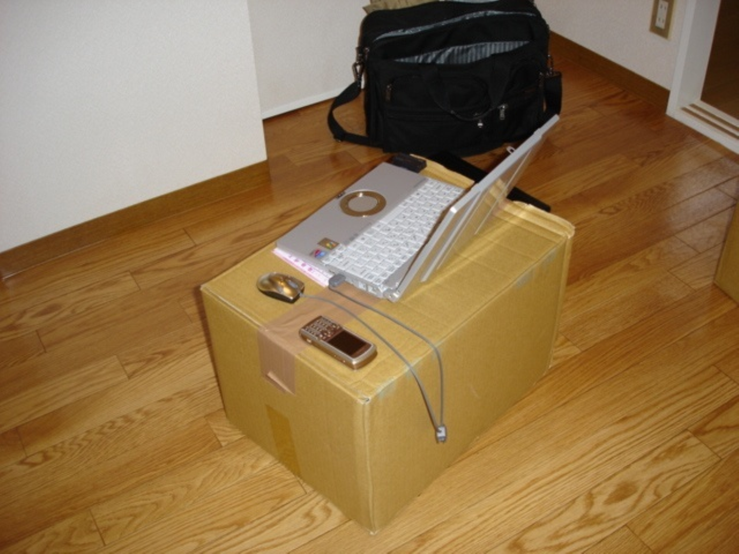 (写真:机も椅子も何もなく、殺風景な部屋の中で段ボールを机替わりにし作業していた頃。)