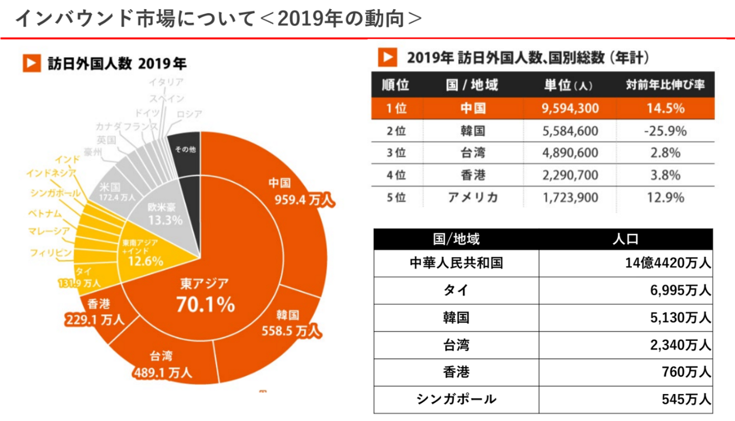 コロナ前の2019年の訪日外国人数を見ると、2位の韓国が約560万人だったのに対し、1位の中国は約1.7倍にあたる約960万人という圧倒的な数になっており、全訪日客の約30%を占めています。