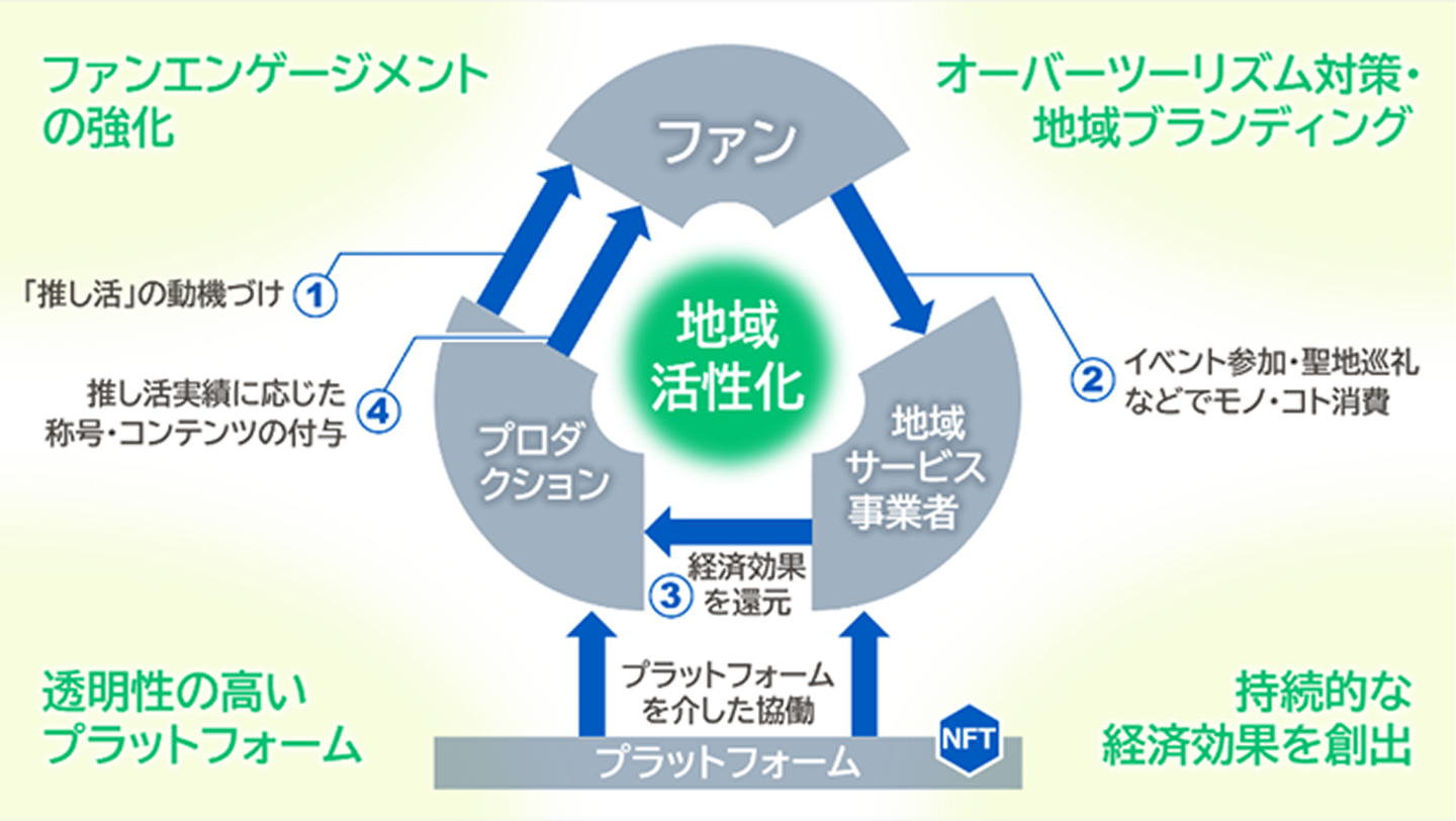 近年、「推し活」に代表されるファンの消費活動は、聖地巡礼やイベント参加などを通じて地域に大きな経済効果をもたらしています。その一方で、オーバーツーリズムの要因となることや、一過性のブームとして終息してしまうケースが多く、地域における経済効果の持続性や、多様化するファンのニーズに幅広く応えられる仕組みづくりが強く求められていました。しかしながら、ファン、プロダクション、地域サービス事業者など多くの関係者が介在するため、仕組づくりの調整に手間や時間を要すことや、推し活の効果が把握しにくいなどの理由により、ビジネスモデルの確立が難しく、その実現には至っていませんでした。