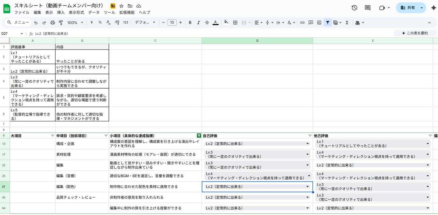 クリエイティブチームの動画制作メンバーのスキルの習熟度を可視化し、課題の発見や育成に役立てることを目的としています。