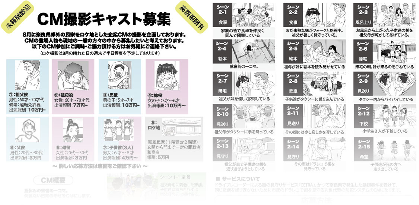 7月下旬:奈良県で撮影を予定していたため、大阪の映像制作会社3つに見積もりを依頼。その中で撮影力に最も優れていると感じた制作会社と契約。順調に調整は進んでいたのだが、キャストに関して1点問題が浮上。制作会社から提示された子役の映像を見ていたところ、これまでCMを見ても感じたことは無かったのに、いざ自分が映像を作ろうとなると、キッズスタジオに登録している子役の演技感に違和感を感じるようになった。そこで、演技ではない、自然さを求めてキャストは一般素人から募集することに決定。Illustratorで簡単なキャスト募集チラシを急遽作成し、奈良県の撮影候補地付近を中心に5万枚ほど巻いてキャストを募った。チラシの印刷と配布で約20万円。