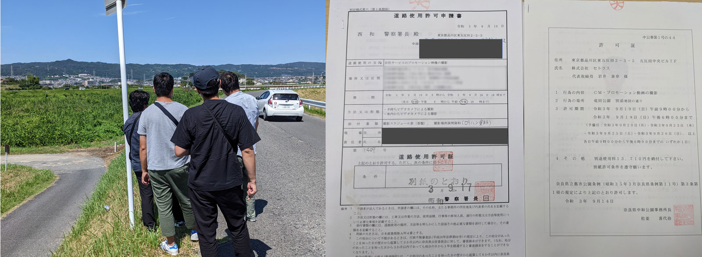 9月上旬:イメージに合う場所を自分で車で走って探し回り、大体のあたりをつけた上で後日撮影クルーとロケハンを敢行。また、予算を抑えるため、警察への道路使用許可申請や県土木管理事務所への公園使用許可申請、タクシーやケータリングの手配は自分で行った。