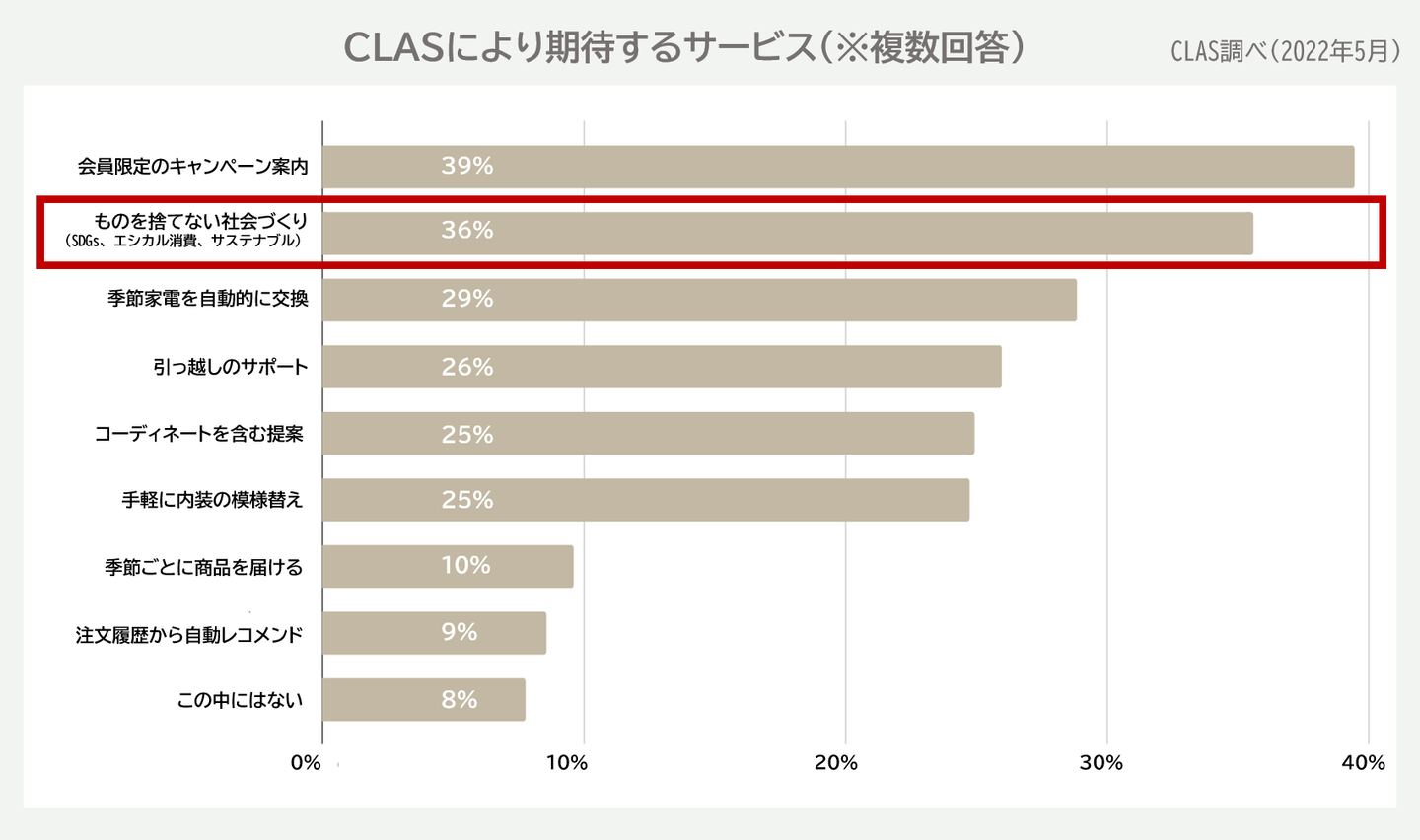 「“暮らす”を着替える」をコンセプトとした家具・家電のサブスクリプションサービス「CLAS(クラス)」において、登録者を対象にWebアンケート調査を実施した結果、登録者の約4割がCLASの目指す「ものを捨てない社会づくり」実現に期待していることがわかりました。