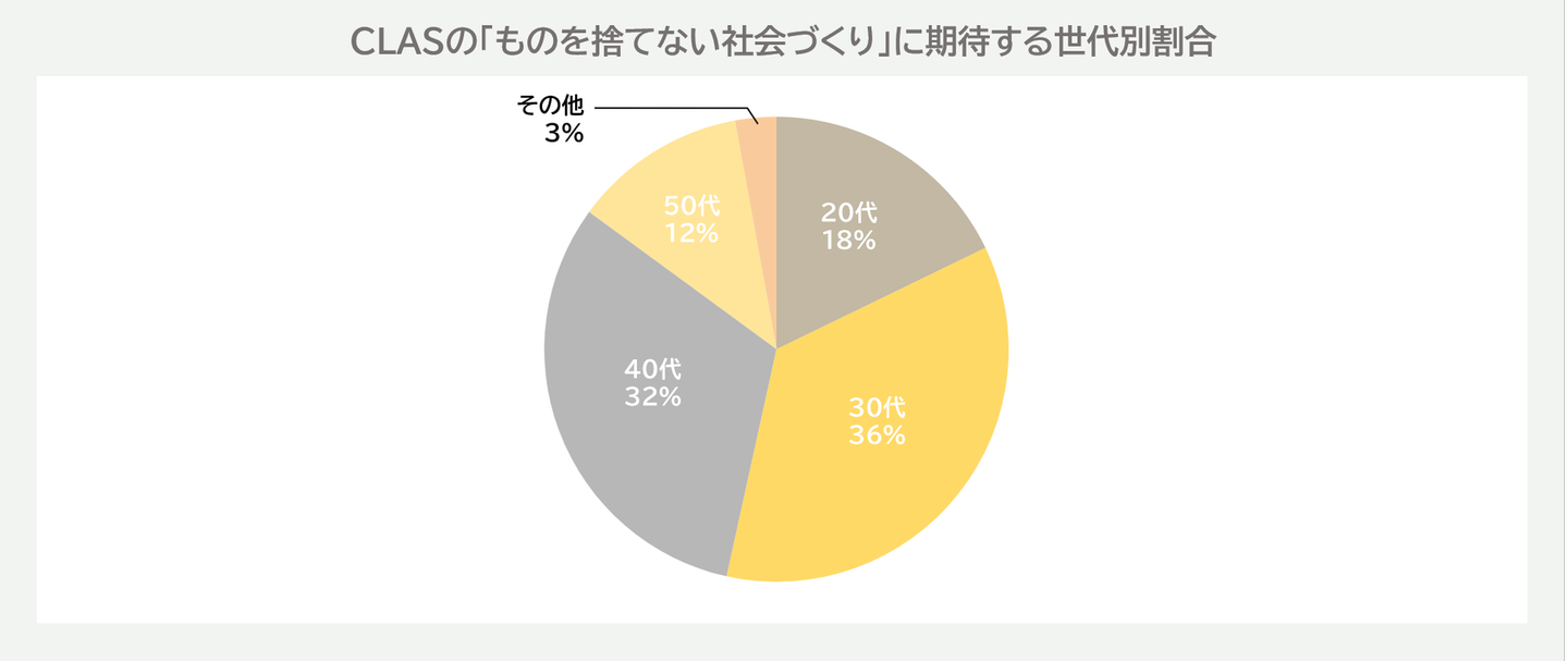 CLASの「ものを捨てない社会づくり」に最も期待する世代は30代が最多の36%、次いで40代の32%となり、幅広い世代に支持されています。