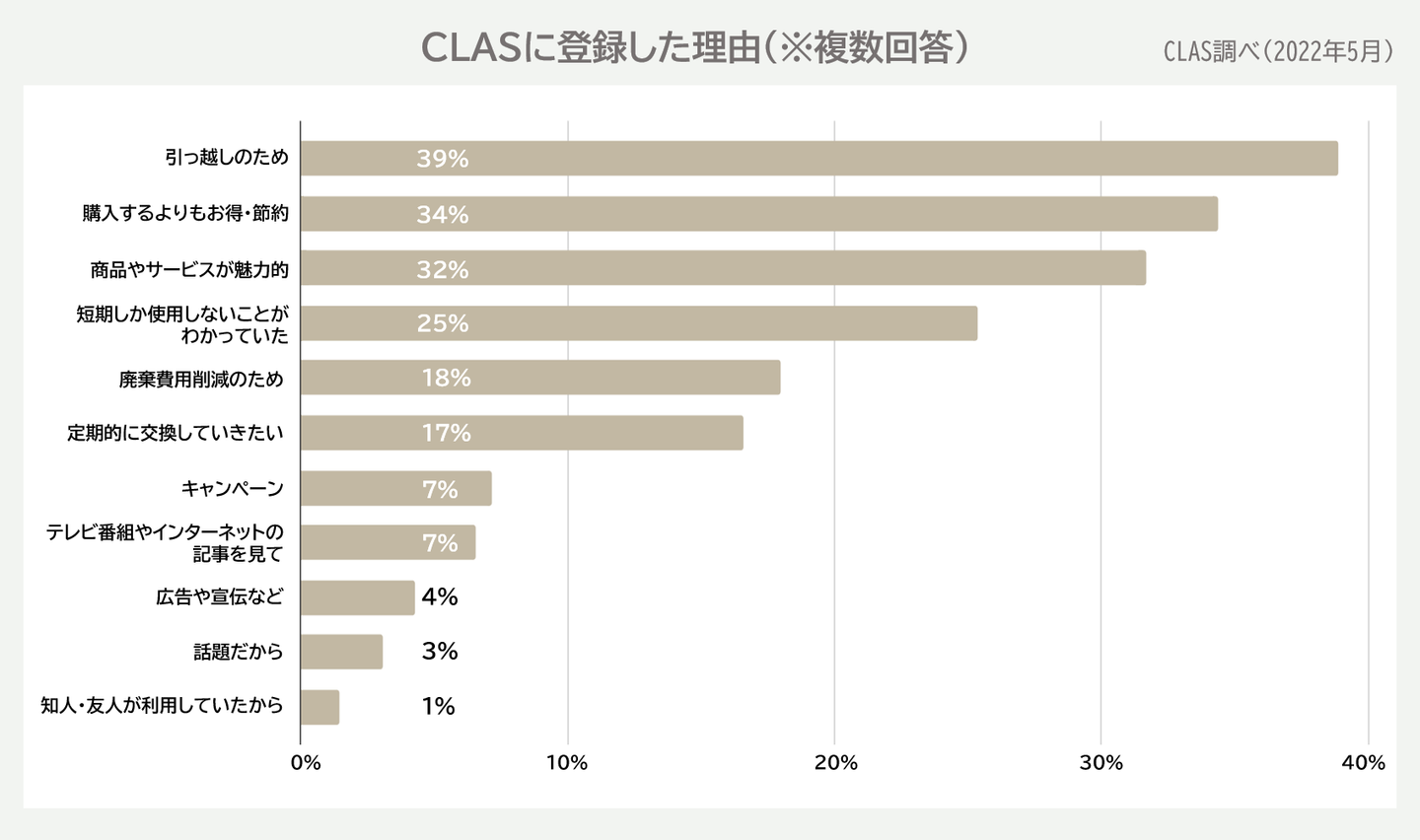昨年に引き続き、CLASに登録した理由として「引っ越し」が最も多い結果となりました。新生活などの引っ越しの際、家具・家電をレンタルする選択肢の定着化がうかがえます。また、商品やサービスに魅力を感じて登録した方が32%と、昨年の約25%より増加したことも特徴的です。