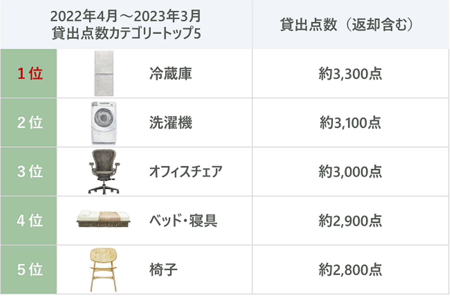 2022年4月~2023年3月の家具・家電の上位カテゴリーは、冷蔵庫・洗濯機といった生活必需品、かつ大型で重量があり、購入すると高額な白物家電が上位を占める結果となりました。