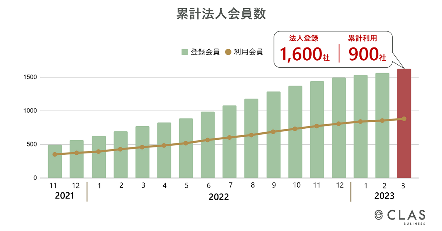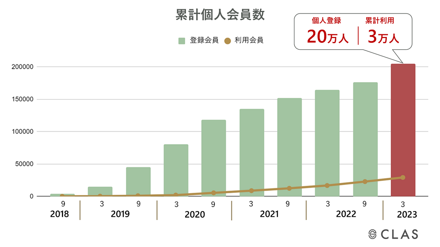 2023年3月時点におけるCLASの個人登録会員は20万人を突破、累計利用者3万人、法人登録会員は1,600社、累計900社にご利用いただきました。