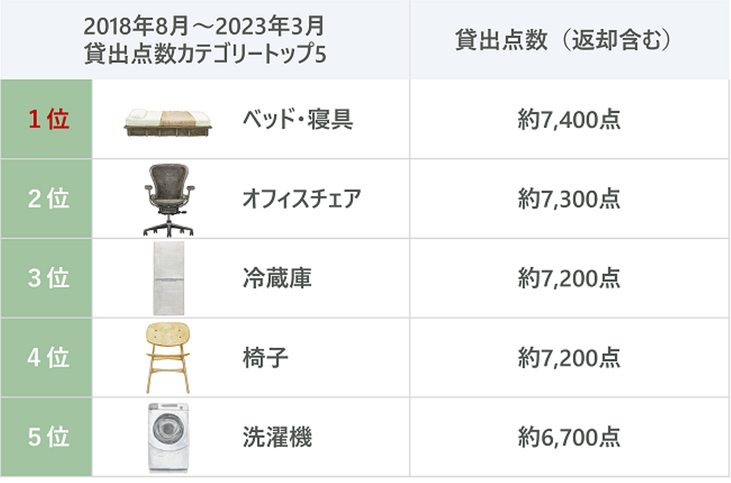 提供開始の2018年8月~2023年3月までのトータル期間で見ると、家の中でも大きな家具であるベッドの人気が高く、働き方の多様化により、自宅でのテレワーク需要やオフィス環境のアップデートのため、オフィスチェアの需要も継続しています。