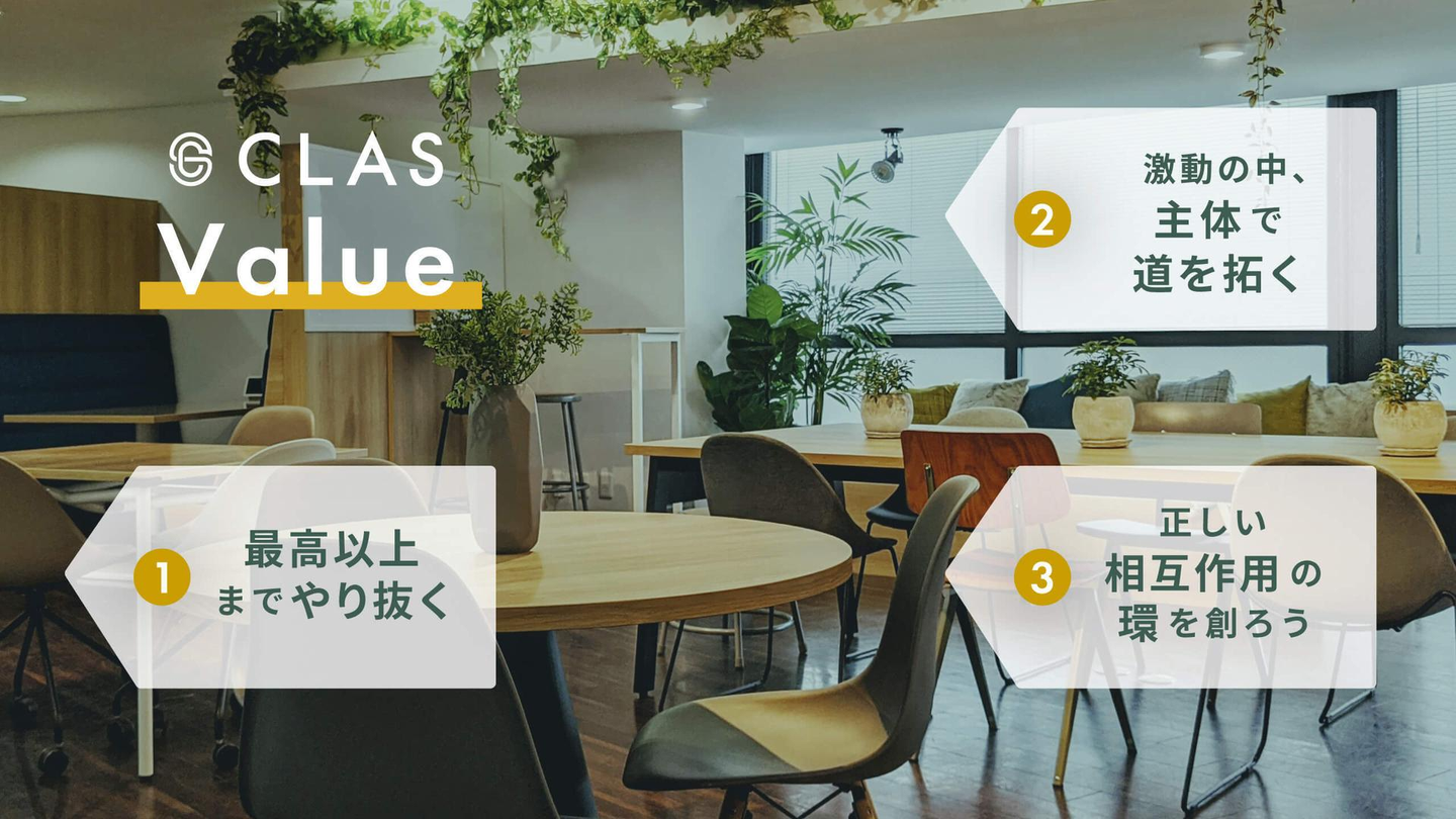 こんにちは!CLAS 採用企画の半澤です。今回はCLASが最も大切にしている、社員に求める価値観『バリュー』についてご紹介します!CLASにとっていかにバリューが重要であるか、改めてご説明できれ...
