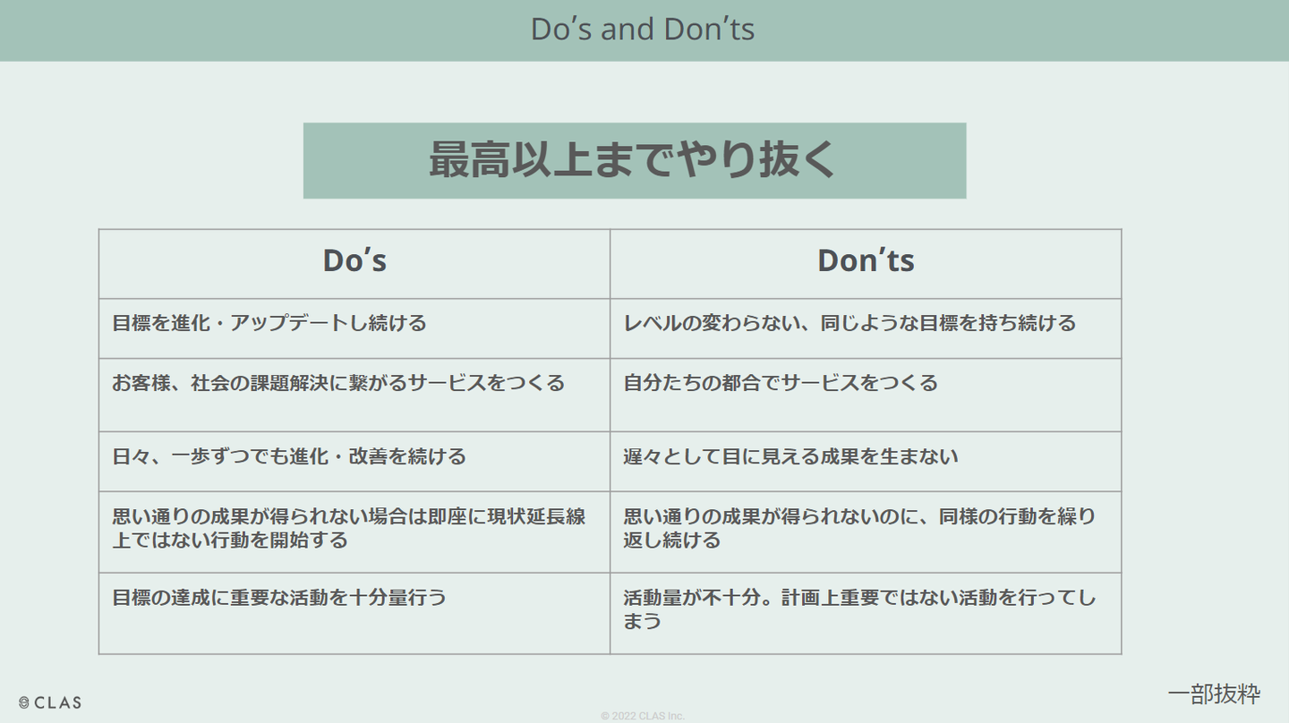 シンプルにすればするほど、以前からの課題である解釈の差分が大きくなる可能性もあるので、今回から各バリューごとにDo’s and Don’tsという「すべきこと」「すべきでないこと」を明文化して、新バリューと同時に公開しました。