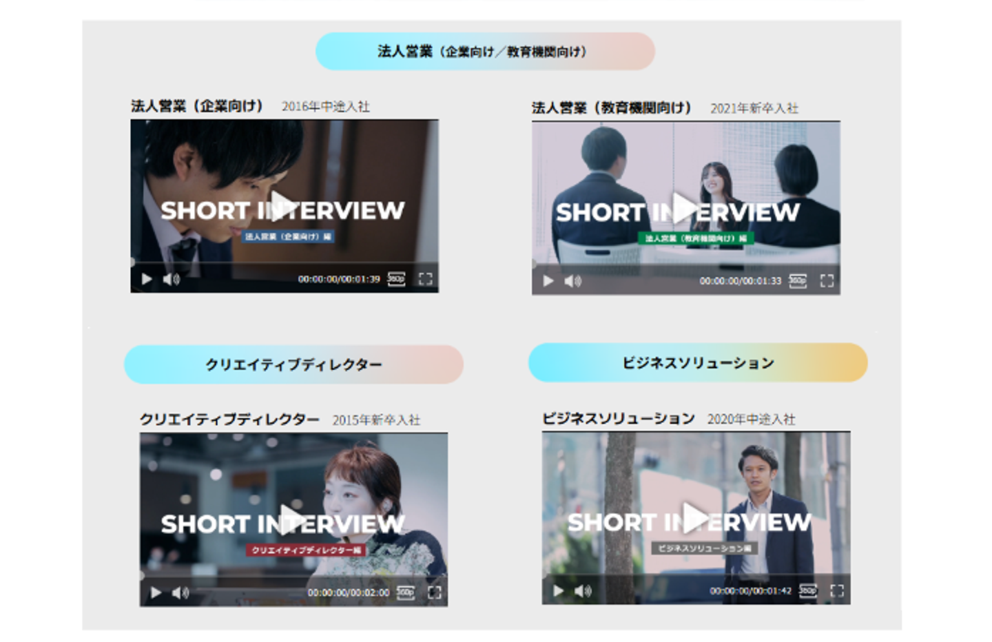 職種ごとに、新卒・中途入社者のインタビュー動画を公開しています(1本あたり90秒~120秒)。