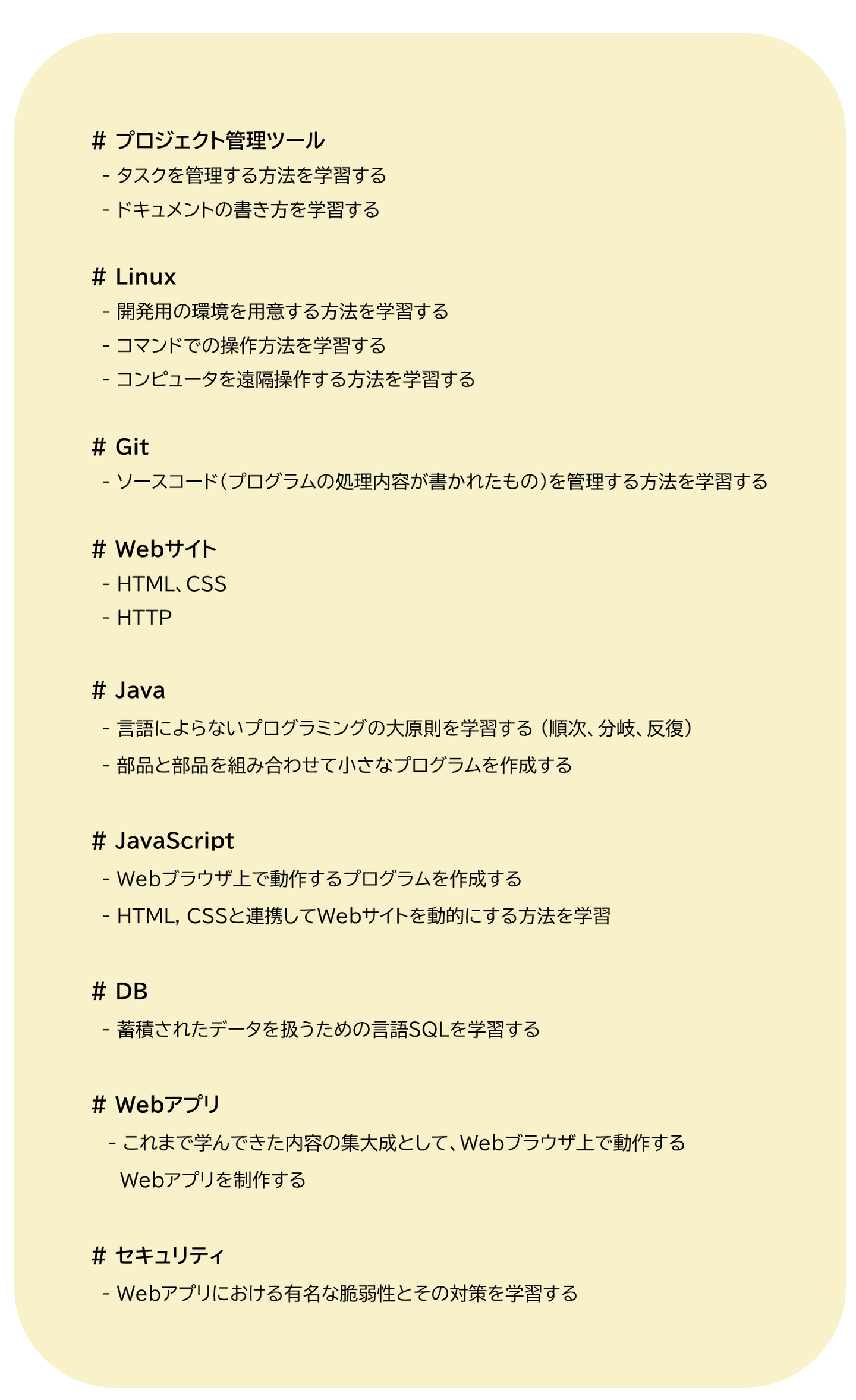 このように、プロジェクト管理・開発環境構築・プログラミング・Web技術・セキュリティまで、幅広い分野に触れながら、実務につながるスキルを段階的に習得していきます。