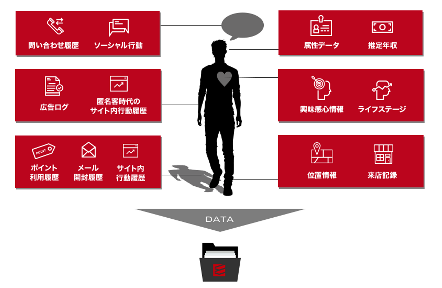 顧客データを蓄積するためのプラットフォームです。DMP(データマネジメントプラットフォーム)では、ウェブ行動履歴などのデジタルデータ、ERPやCRMといった社内データ、SNSやジオデータなどの外部データを統合して意思決定や業務改善に役立てますが、その「顧客情報管理」に特化したものをCDP(カスタマーデータプラ ットフォーム)と呼びます。