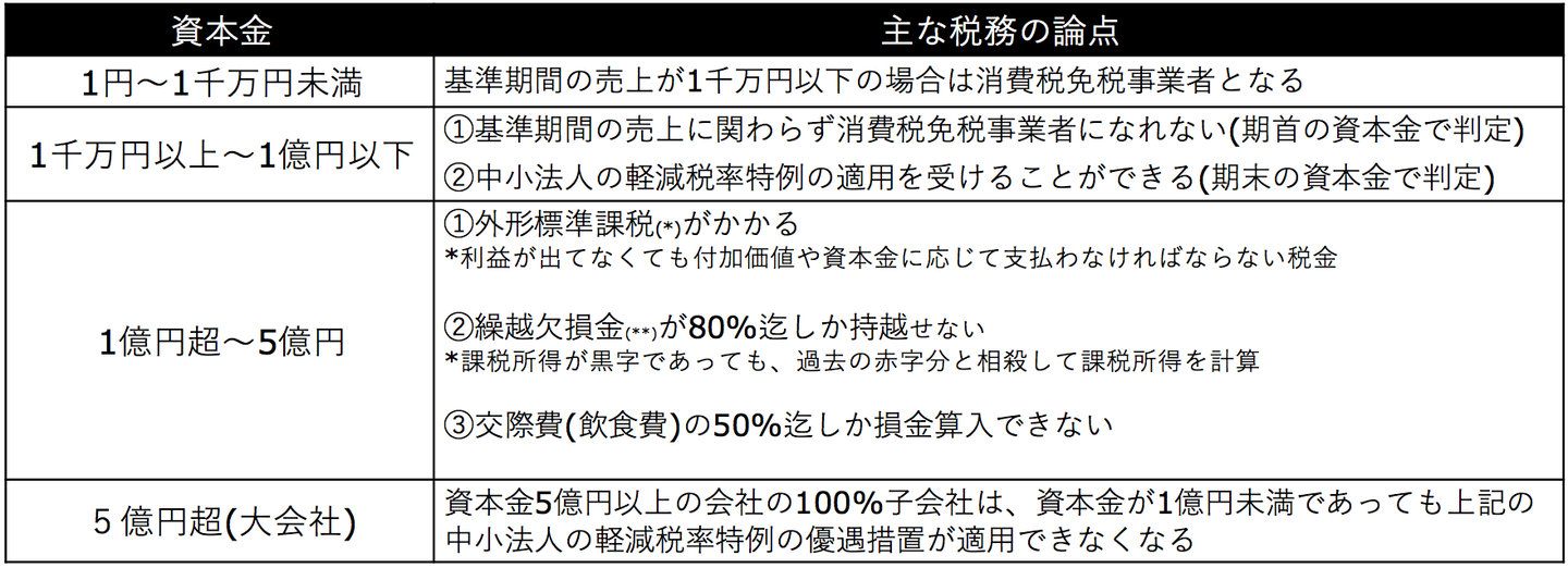 役員・株主として迎い入れる仲間、社名、本店所在地・・・などいずれも重要ですが、私は税務上の観点で「資本金額」が重要だと考えています。詳細は後述しますが、以下の通り資本金の違いで税務上様々な論点があります。この記事を読んでいただけると、初年度で「数百万円」(GAUSSの場合)インパクトのある税務論点をご理解いただけます。長文となりますが、読者の皆様が起業する際の参考になれば幸いです。