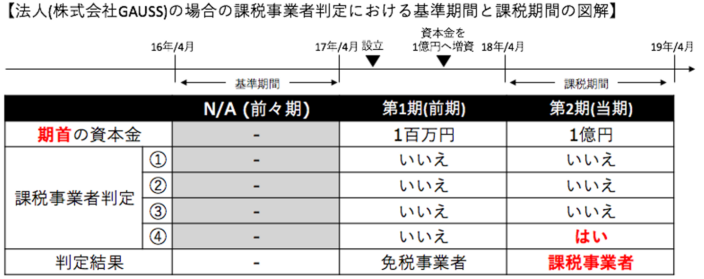 GAUSSの例でいうと、現在第2期目で①の判定基準は「いいえ」なので、今期も消費税免税事業者になれるかというと、それほど単純な問題でもありません。第1期目で1億円超の資金調達をして、資本金を1億円に増資したので、「④新設法人の納税義務の免除の特例」により2期目からは消費税免税事業者ではなくなります。消費税免税事業者であれば数百万円節約できるのに・・・と非常に残念な思いです・・・。