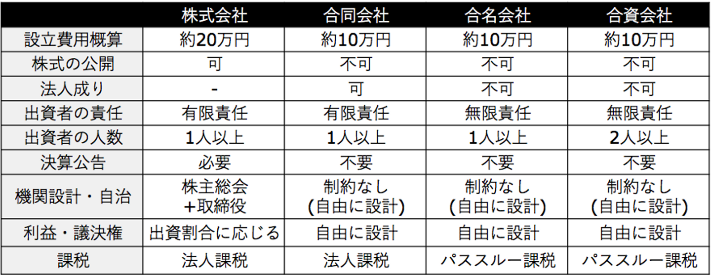 会社法の条文を見ると、第2条に「会社とは、株式会社、合名会社、合資会社又は合同会社をいう。」と、会社形態が4種類出てきますね。