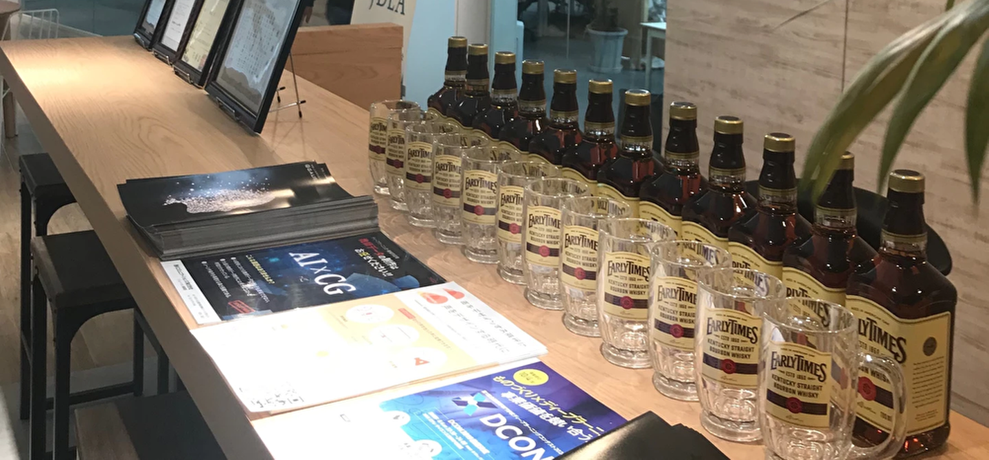 こちらがGAUSSのエントランス写真。入ってすぐ目に飛び込んでくるバーカウンター風のテーブルには、アーリータイムズのボトルとグラスがずらり。アメリカ競馬三冠レースのひとつ「ケンタッキーダービー」の公式飲料ということで、弊社代表がご友人から頂いたものらしいです。