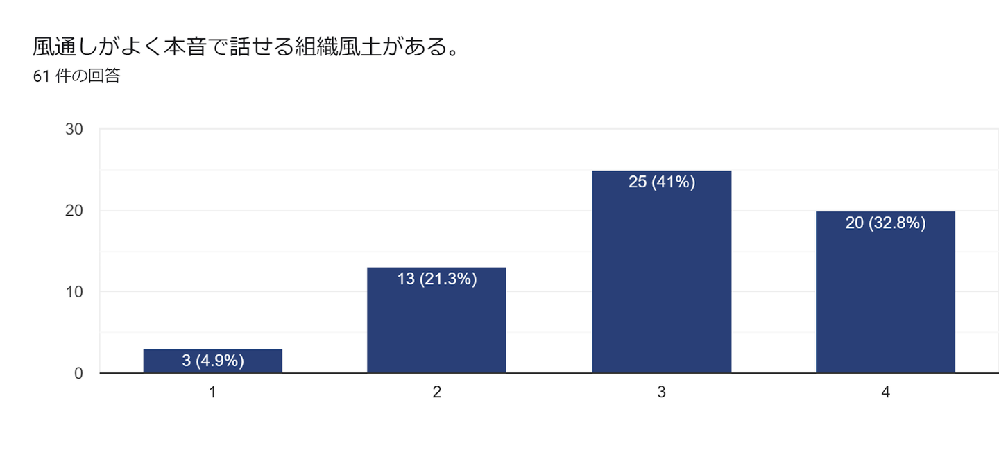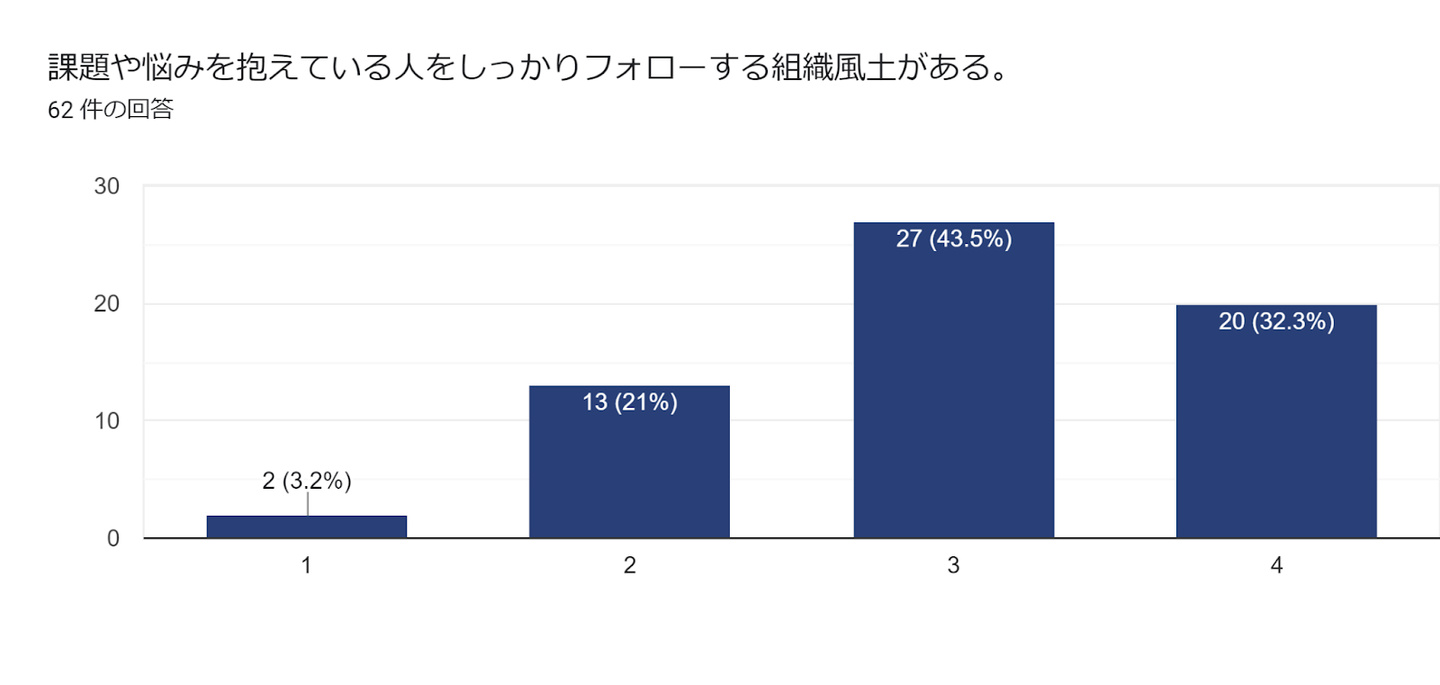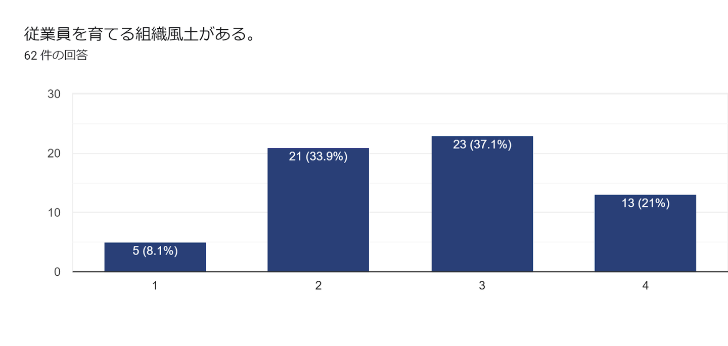 課題や悩みを抱えている人に対しての社内からのフォローや、本音で話せる組織風土については、「70%以上の方が思う・そう思う」と感じている一方で、従業員を育てる風土があるか?という質問には、「58.1%の方しか思う・そう思う」とは感じていない結果になりました。