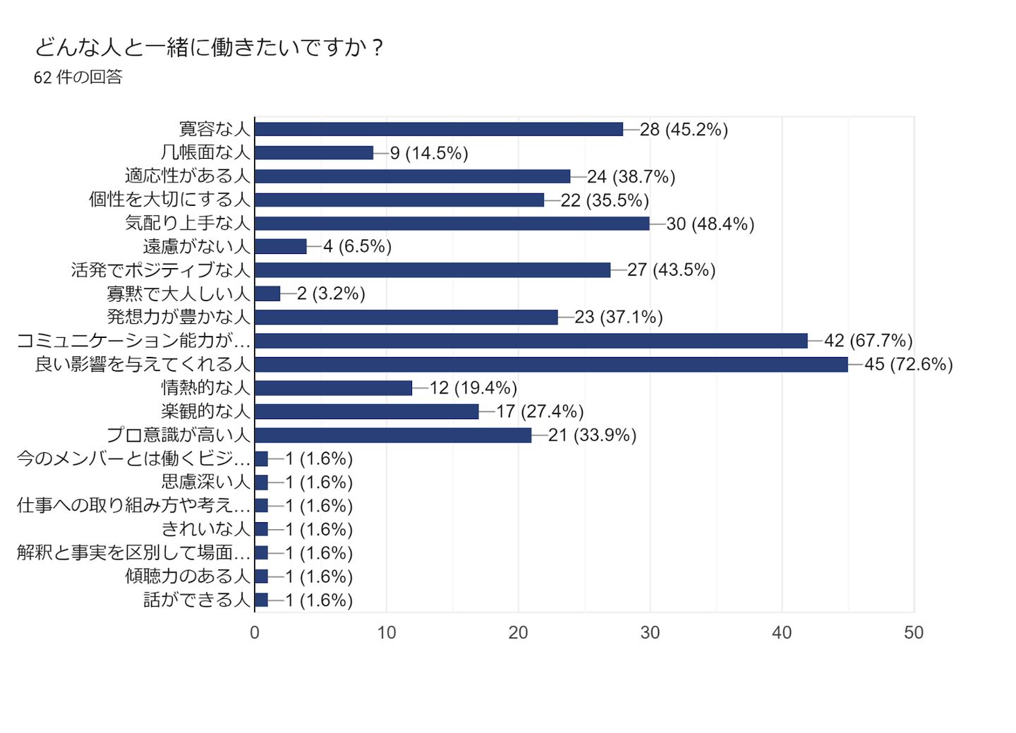 トップは「良い影響を与えてくれる人」次点で「コミュニケーション能力が豊かな人」で「気配り上手」「寛容さ」「活発でポジティブ」と続いていきます。