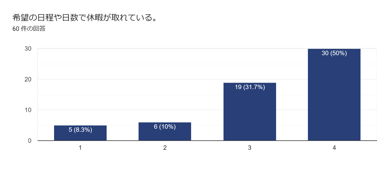 約80%前後の従業員が、休日の取りやすさやワークライフバランスについてご満足いただけている結果となりました。