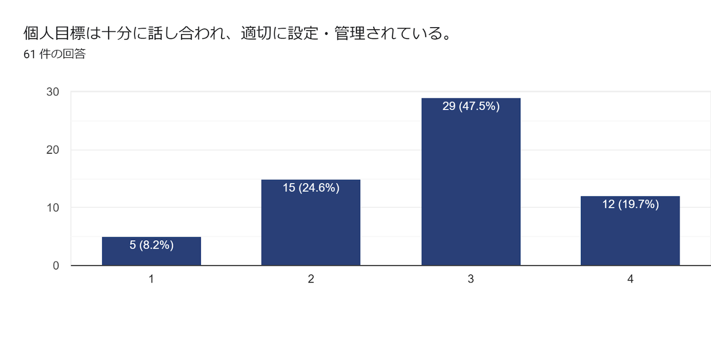 こちらも興味深い結果となりました。個人目標の適切な設定や管理がされているか?という質問に対しては、「思う・そう思うと感じている方が67.2%」という結果になり、及第点には届きませんでした。