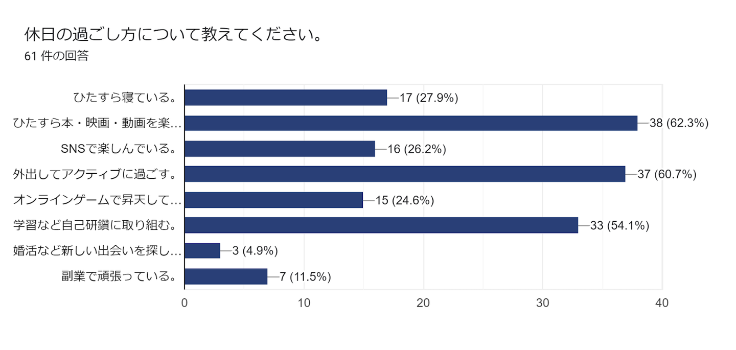 休日の過ごし方については、アクティブと非アクティブがイイ感じのバランスになっているような気がします。特筆すべきは、学習などの自己研鑽に取り組む方が全体の半数を大きく超えていますね!