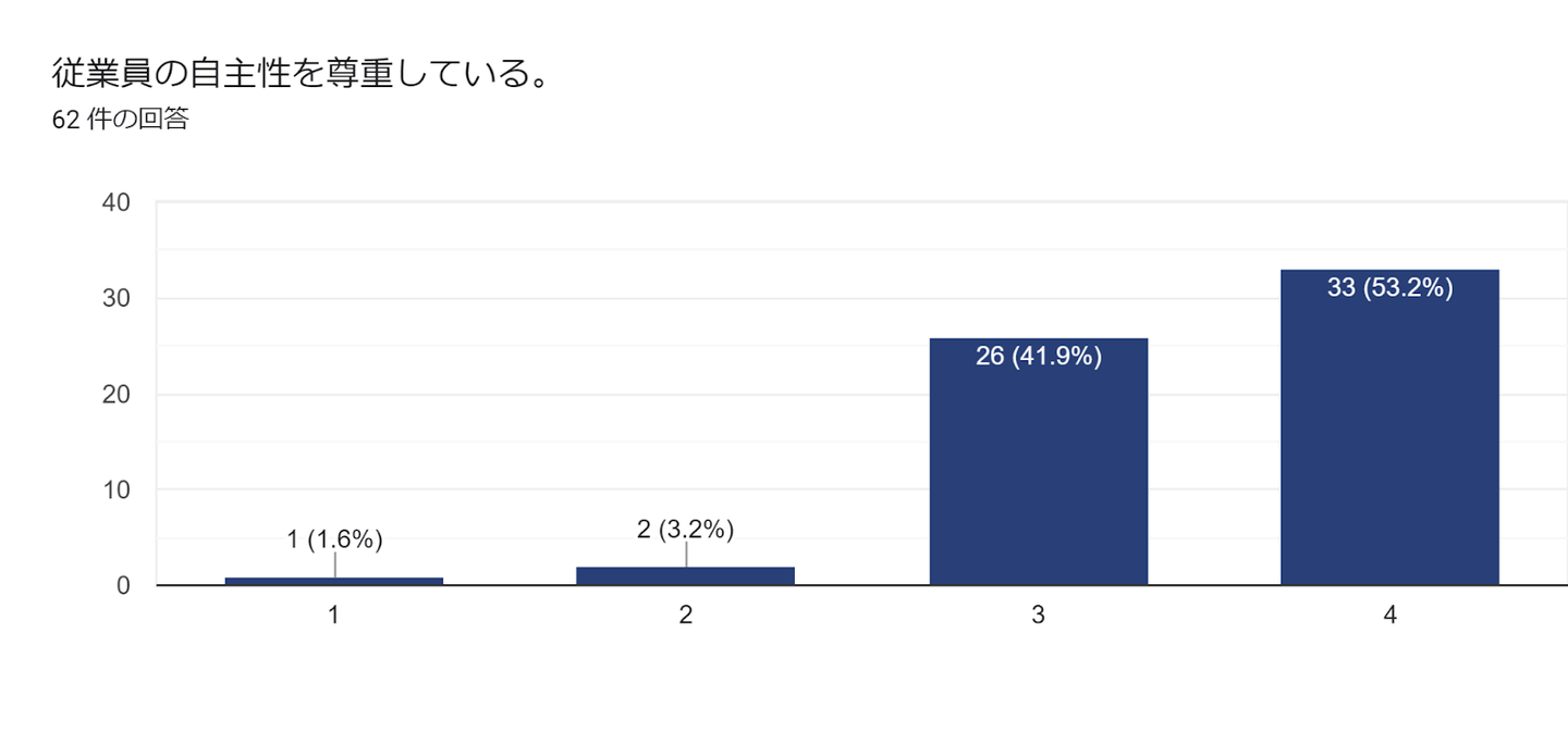 一方で、少数ではあるもののそう感じていない従業員も存在しています。どういった要因があるのか。それぞれの感じ方にも意識を向けつつ会社運営に反映していきたいと考えます。