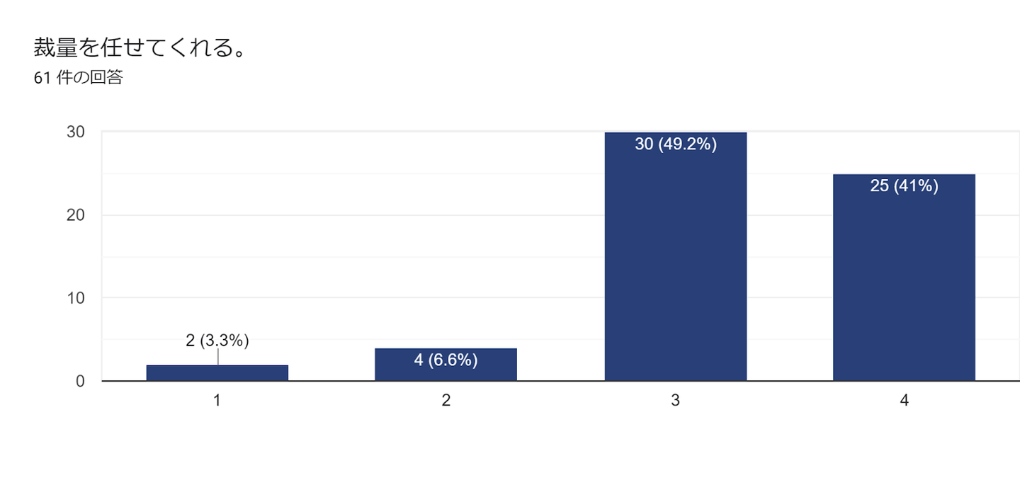 自主性や裁量については、どちらも90%以上の方が思う・とても思うという結果になりました。