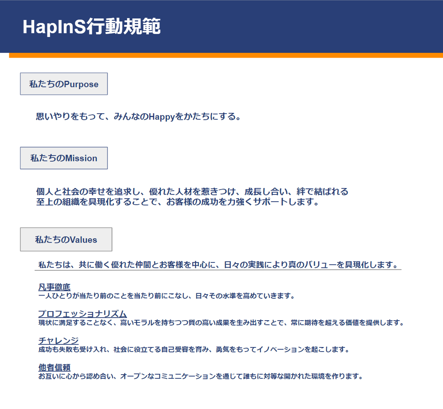 今回は、パーパス・ミッション・バリューをHapInS行動規範としてまとめました。