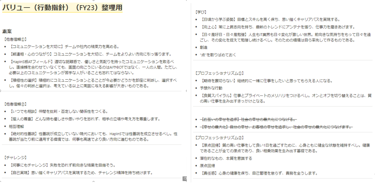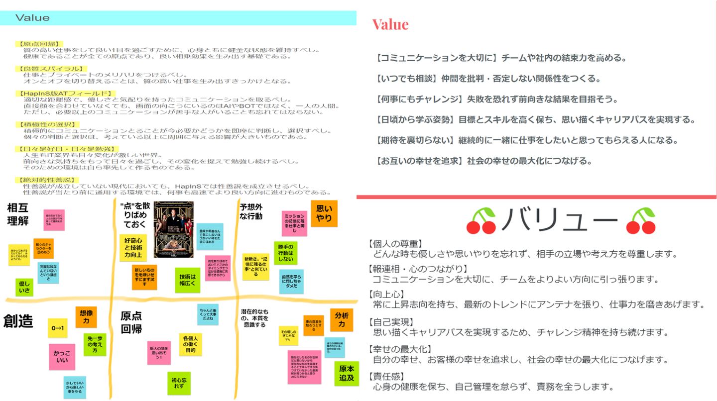 最後にバリューですが、ミッション案同様にジャンルごとに分けてみて、そこから閃くタイトルを付けていきながら説明文を創出していくという作業を行いました。