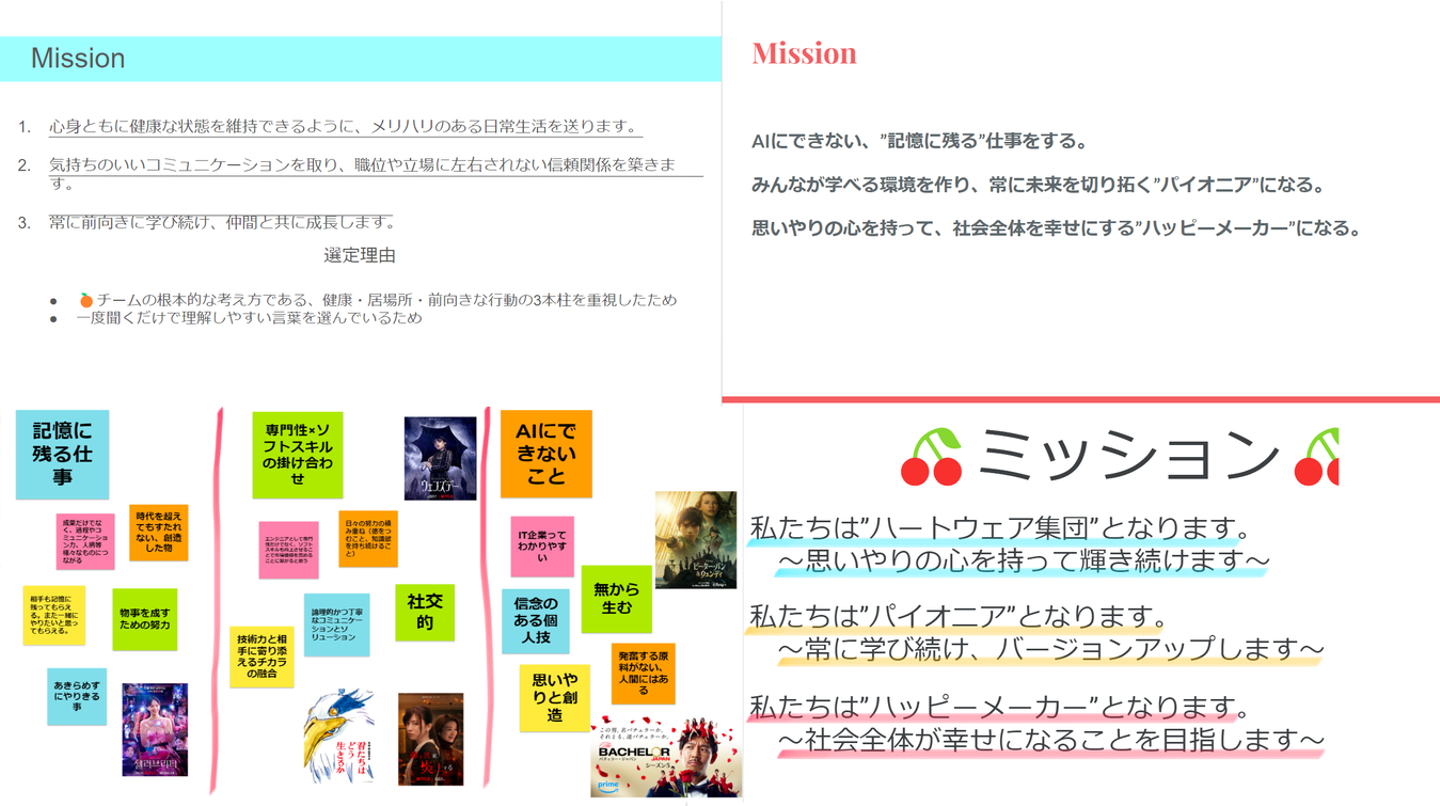 次に、ミッション案ですが当初は3つ作る予定でしたが、議論の末に一文にまとめようというかたちになりました。