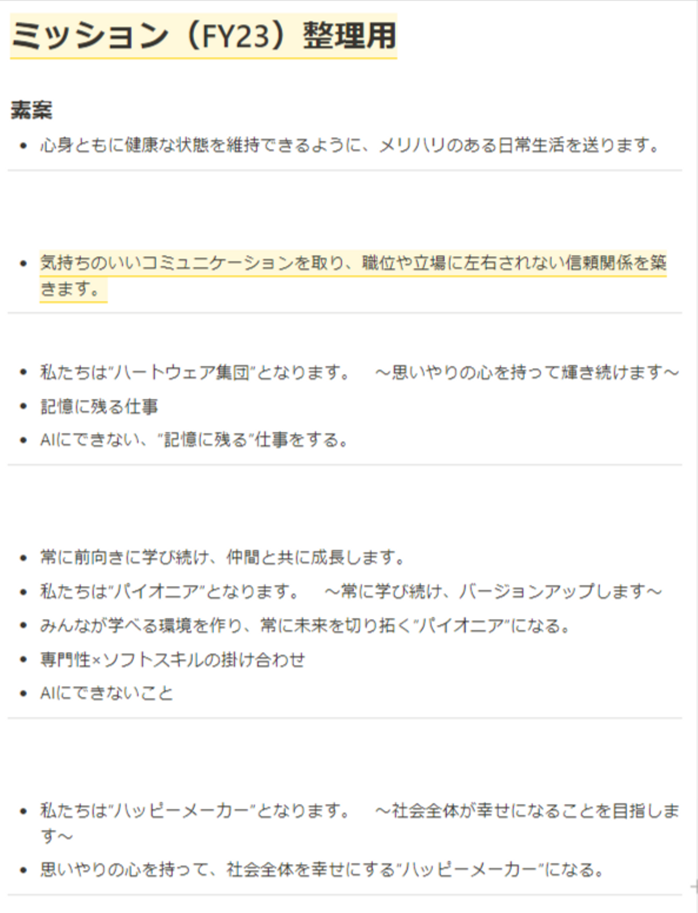 以下は、議論用に各チームが出してくれたミッション案をジャンルごとに分けたNotionページです。ジャンルとしては「健康」「信頼関係」「アウトプット(成果)」「学び」「HAPPY」として分けており、それを一文にまとめて社内外に訴求できるようにまとめあげていく作業を行いました。