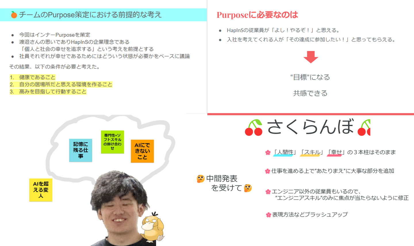 まず、パーパス案は満場一致で「思いやりをもって、みんなのHAPPYをデプロイする」に決定しました。