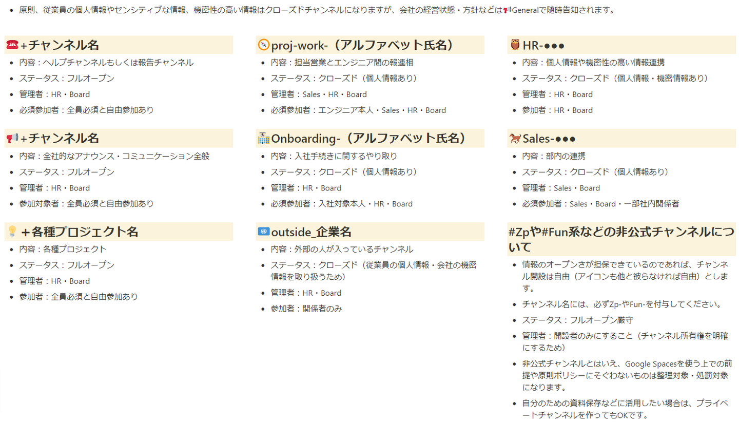 各従業員が必要だと思ったチャンネルは自由に開設してもらって構わないというルールなのでチャンネル開設時のルールは最初に決めておきました。