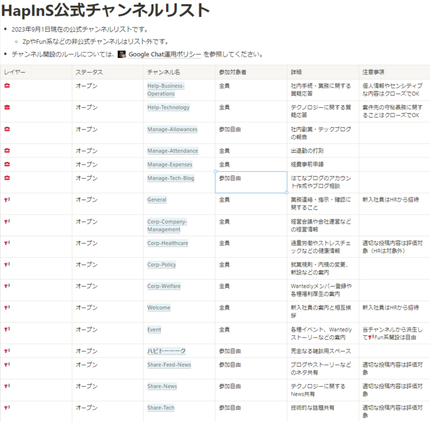 次にHapInS公式チャンネルリストを作っておくことで、各自の判断でチャンネル参加してもらいやすいようにしています。