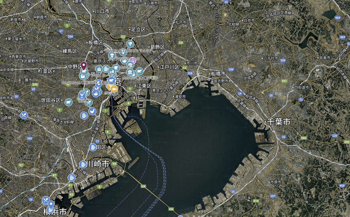 このサークル、実はオンラインでも各自活動してるんです!それが、みんなで作る「グルメ探究図鑑」ことGoogleマイマップ! メンバーそれぞれが自分専用のレイヤーを持っていて、お気に入りのカフェやとっておきのレストラン、はたまた「ここ行ったよ!」っていうお店を地図にどんどんピン留めしてるんです。