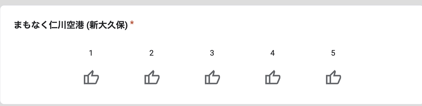 Googleフォームには、星(⭐)や親指(👍)、ハート(🩷)のアイコンで評価できる機能があるんですが 、今回は5段階評価で「どれくらい行きたいか」を直感的にポチッと投票!
