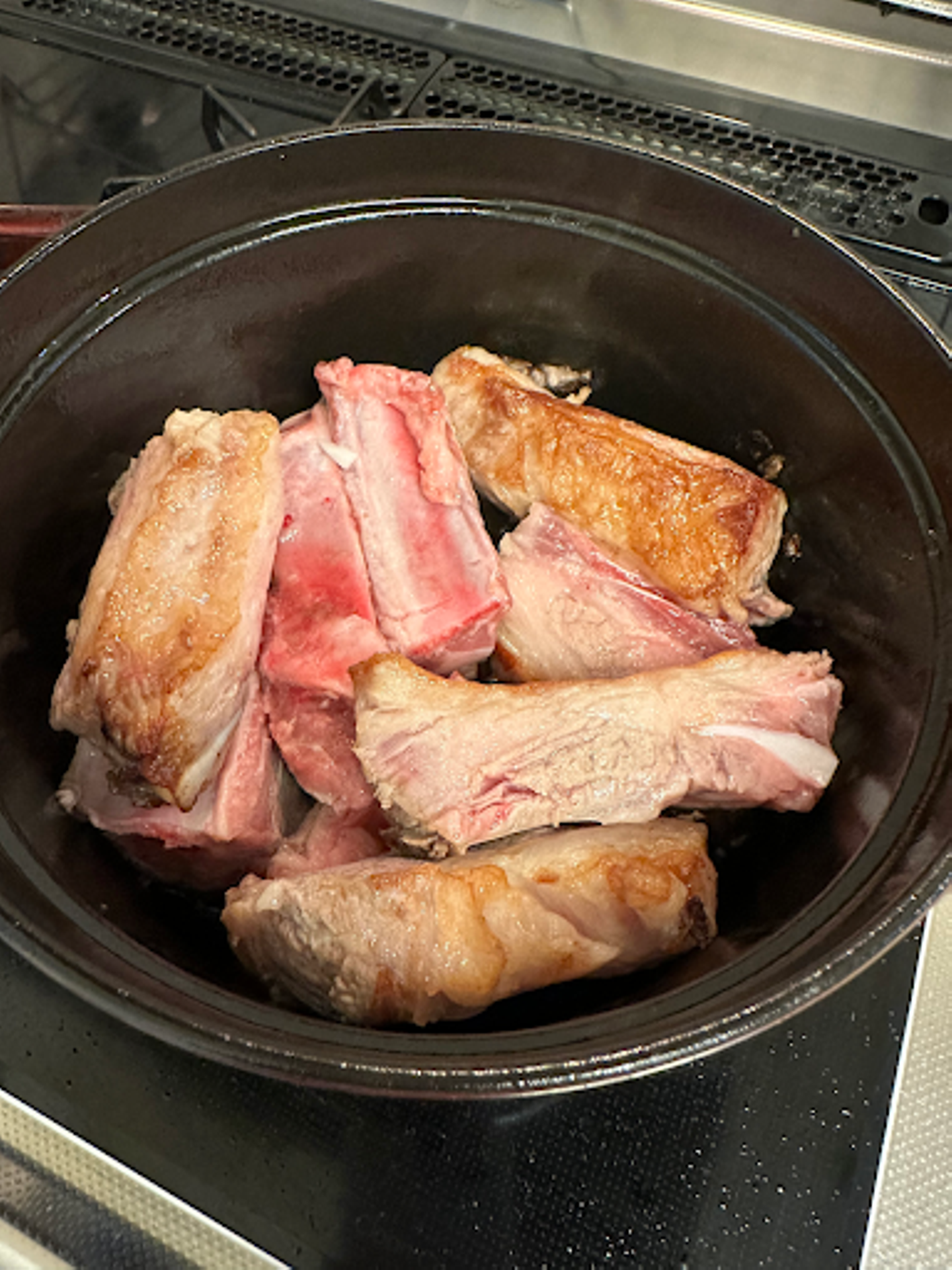 100g105円の肉(※もっと高くてもいいです)を、昼休みに鍋に放り込んでてきとうにジュッと焼きます。