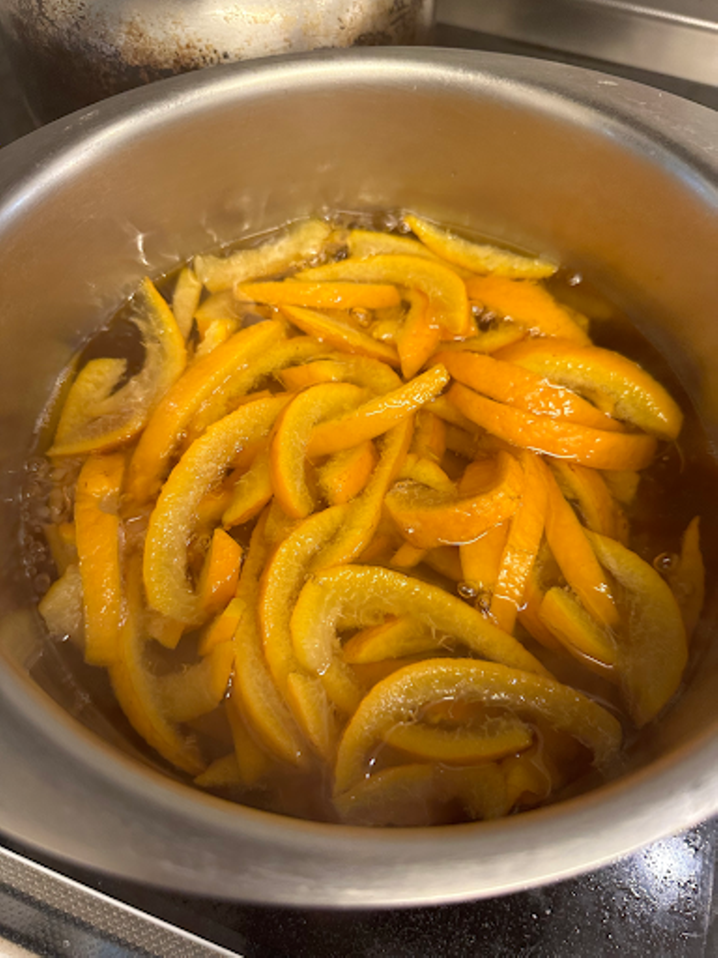 朝、夏みかんの皮を刻み、砂糖と水を入れて火にかけます。