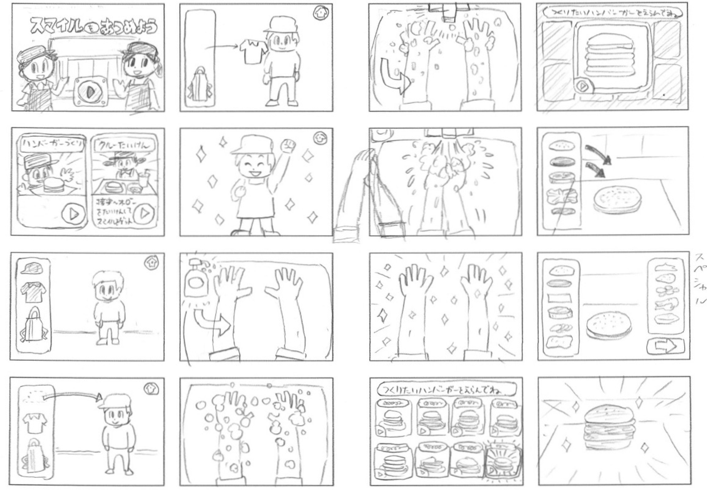企画の方向性が固まったら、流れをエンピツで描き起こし、文章で補足しつつ絵コンテを作成します。絵コンテができたら社内確認後、いよいよ企業担当者さまとのお打ち合わせをセッティングします。そこで企業さまのポリシーに沿っているか、内容に問題ないかを確認し、必要に応じて調整を重ねます。