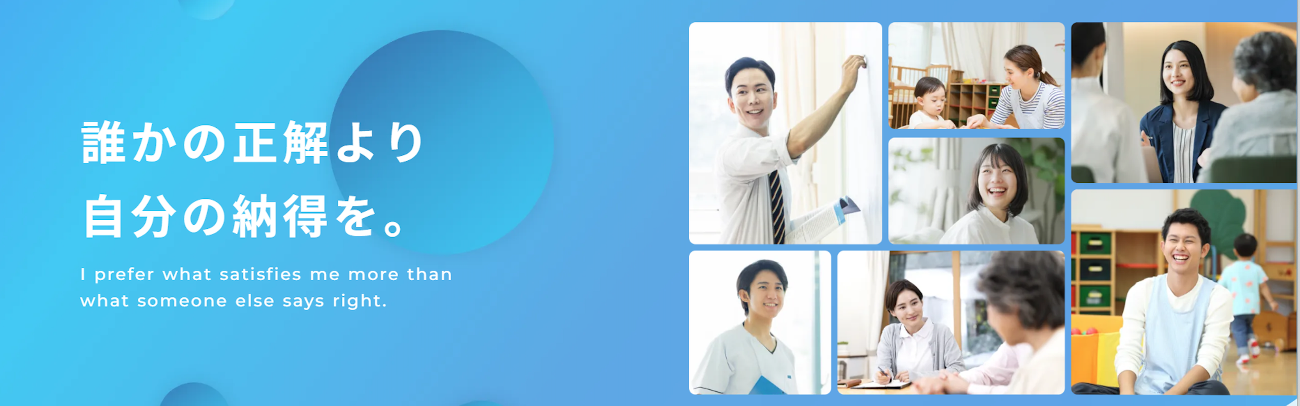 なんとなく続けているけれど、このままでいいのか、答えが見つからない人がいる。 私たちは、教員、公務員、保育士、看護師、介護士など、 社会を支える人たちが、自分の選択に納得できるように、新しい視点を届けていく。見えている世界が変われば、 働くことの意味も変わると思うから。迷うことも、 立ち止まることもきっとあると思う。 しかし、今どこにいるのかを見つめるためのとても特別な時間。 大切なのは 「正しい答え」 を見つけることではなく、「自分の選択に納得ができる」こと。それは、働くことが、もっと心地よくなること。
