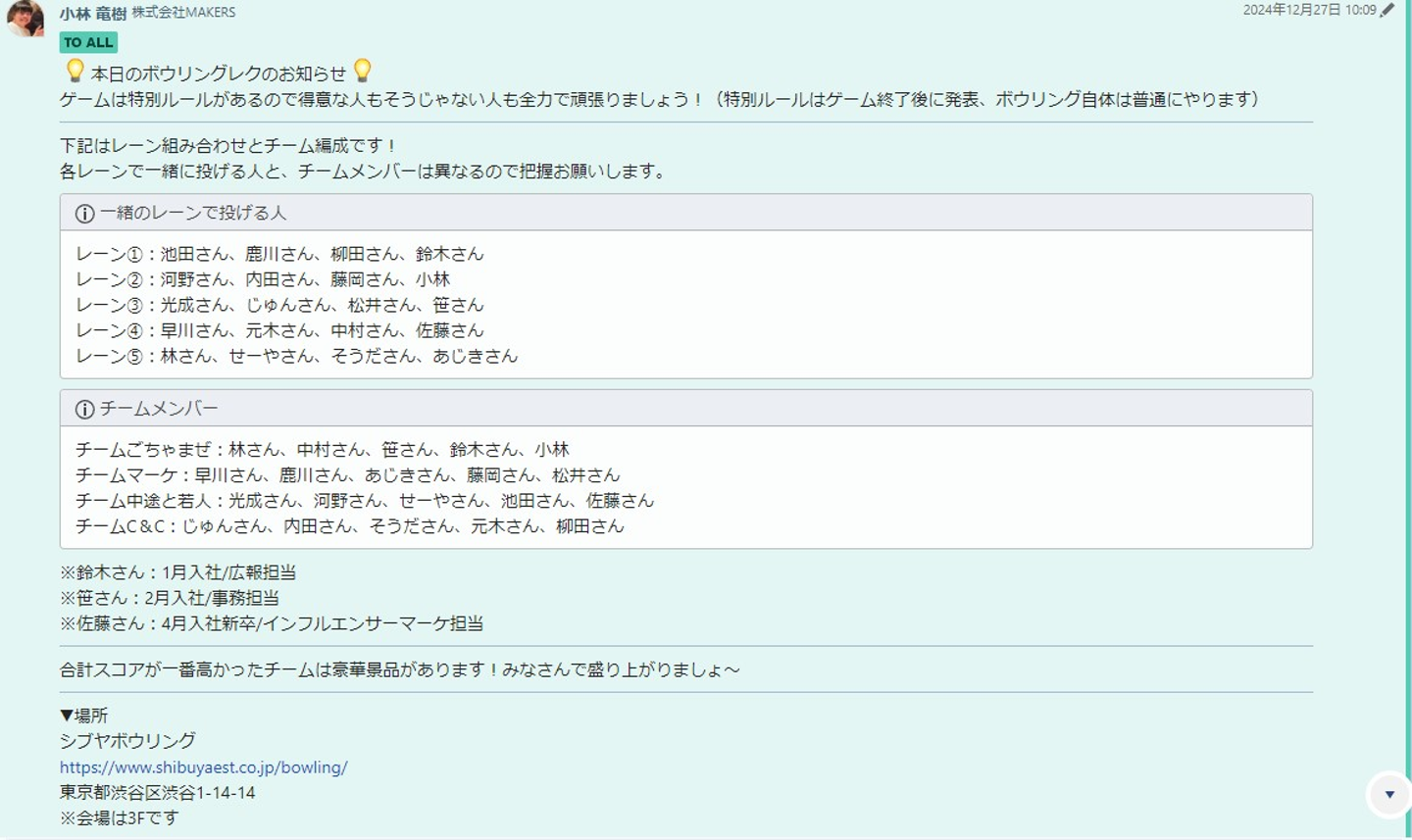 初めて風変わりなレクをやろうと思っていましたが、ボウリングのようなシンプルなスポーツが一番盛り上がるんだなと感じてやってよかったなと思っています。また、テーマを決めたことで、お店選びや景品選びの方向性もブレず行えてよかったと思います。」