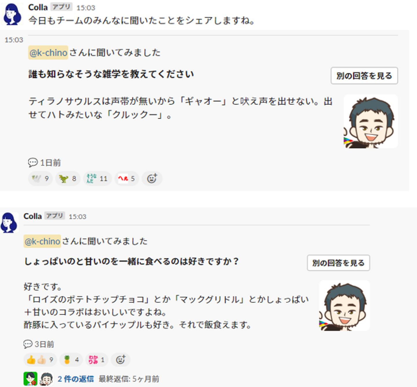 毎日Collaさんが社内のメンバーにインタビューをし、Slackチャンネルでその内容を紹介してくれます。