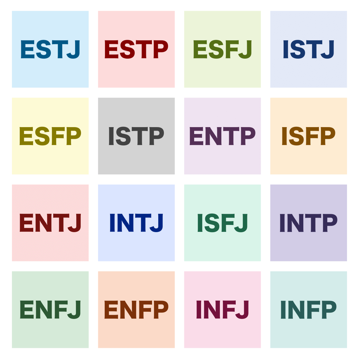4つの軸の特性から、最終的に16の性格パターンに分類されます。各軸の強い方の特性の頭文字を並べた英字4文字が、各タイプの名前になっています。