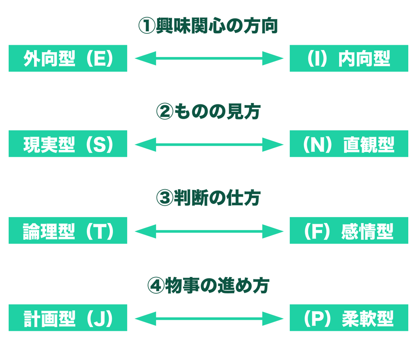 MBTIでは、4つの軸を用いて性格分類を行います。診断を通して、各軸ごとにどちらの特性が強いのか判定します。