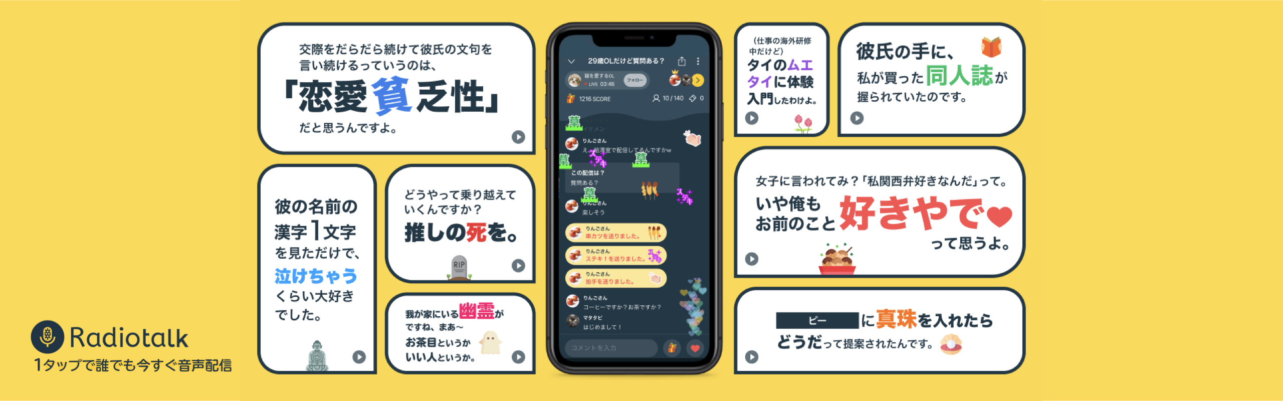 \業界の注目度、上昇中! 累計 約4億円資金調達/ 学生も、会社員も、芸人も、俳優も、漫画家も。 誰でも簡単に「トーク」の形式で、顔を出さずに心理的安全を保ちながら、テキスト以上に「人」を伝えることができるのがRadiotalkです。「意見、思考、思想、感想、思い出などを自由に届けること」を誰でも簡単にできるようにして、個をエンパワーメントする世界を目指します。