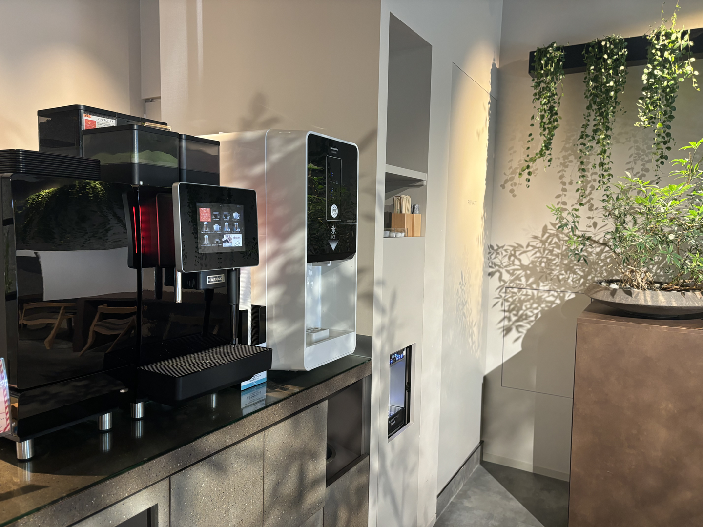 コーヒーサーバー、ウォーターサーバー、電子レンジ、電話ブース、複合機書類溶解BOX etc.が完備されています。