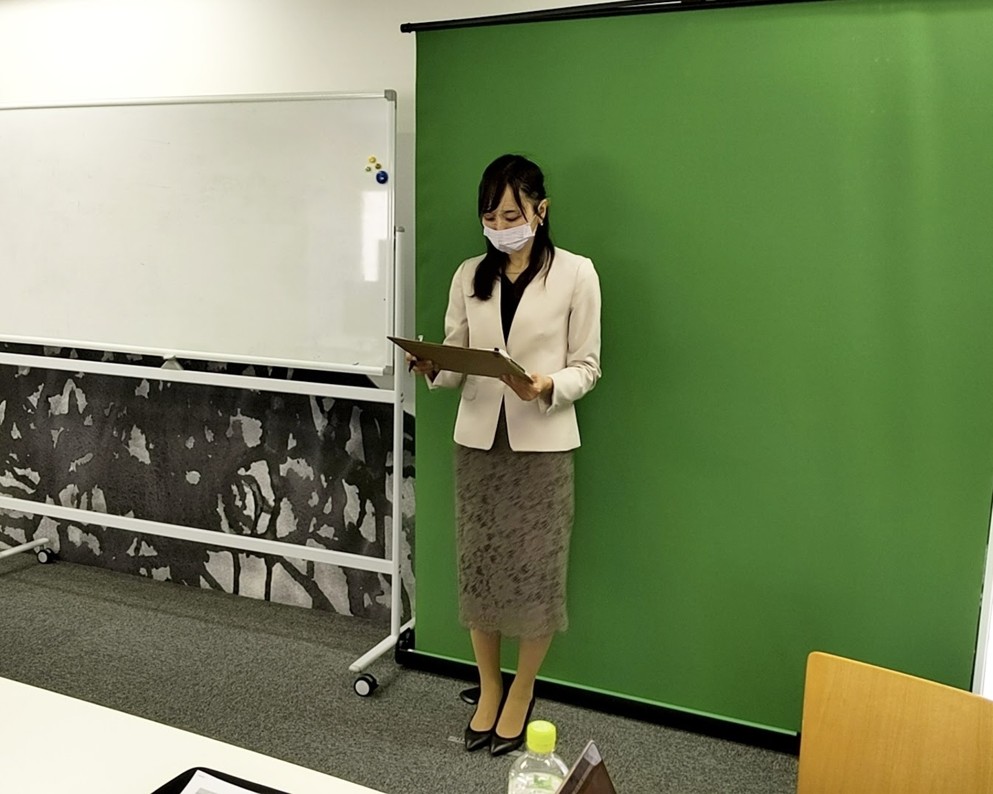 ▲当日司会の岸田さんは、グリーンバックの前で撮影していました!