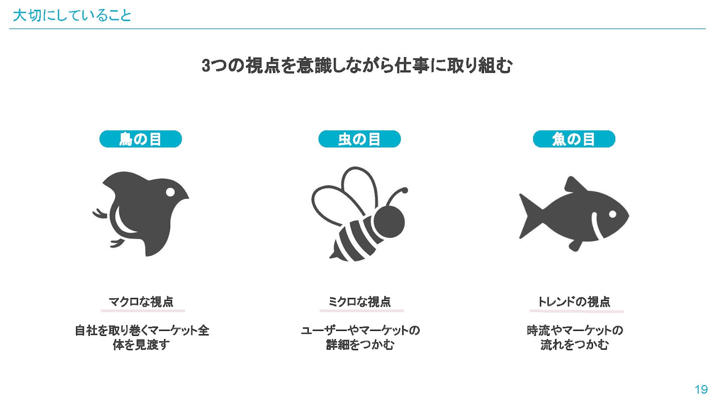 先ほど紹介した3つの目に加えて、第4の「コウモリの目」を増やしたいです。「コウモリの目」とは、固定観念にとらわれず、別の側面から物事を見る視点のことです。今までやってきた施策が本当に正しいのかを常に疑って、常に最適なやり方を模索し続けたいと思います。